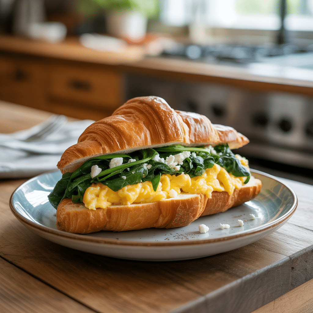 Hey y’all! Let’s talk about that magical intersection of flaky, buttery pastry and a hearty, savory filling. A Breakfast Croissant Sandwich with Eggs & Spinach is exactly what it sounds like—a total upgrade from your usual breakfast routine. Think of piling fluffy scrambled eggs and tender sautéed spinach onto a warm croissant, all held together with melty pepper jack cheese. It’s that bakery-style treat you adore, but made easily in your own kitchen. It feels just a little fancy without any of the fuss.
