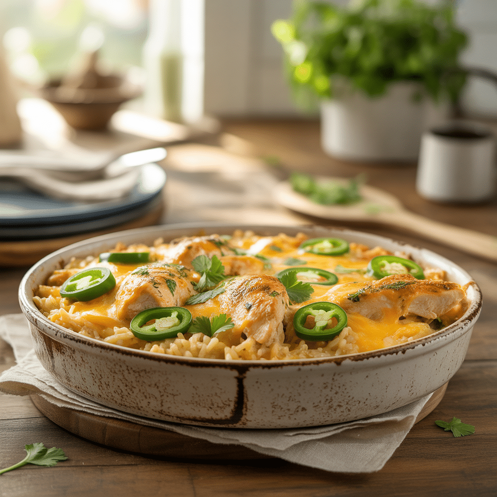 Can I make this dish less spicy? Absolutely. The heat mainly comes from the jalapeños and the canned tomatoes with green chiles. For a very mild version, you can use a can of plain diced tomatoes and reduce the jalapeños to just one, making sure all the seeds and ribs are scraped out. Honestly, if you’re sensitive to heat, this is the way to go. It will still be a flavorful and satisfying easy meal.What are some other healthy chicken recipes that are this simple? If you love the ease of this bake, you might also enjoy dishes like a simple seasoned chicken baked on a sheet pan with veggies, or a hearty chicken and vegetable soup. They’re all part of that family of healthy dinner recipes that don’t require fancy techniques.Can I use chicken thighs instead of breasts? You sure can. Bone-in, skin-on thighs will add even more flavor, but they’ll need to bake for about 10-15 minutes longer. Boneless, skinless thighs can be used with the same timing as breasts. They’ll be incredibly tender. This is a great option for other shredded chicken recipes you might want to try.Is this one of those quick and easy dinner recipes I can prep ahead? Yes! You can assemble the entire dish up to the point of the first bake (through step 4), cover it, and keep it in the refrigerator for up to 24 hours. Just let it sit on the counter for about 20 minutes to take the chill off before baking, and you may need to add a few extra minutes to the baking time. This Cheesy Jalapeño Chicken and Rice Bake is truly a lifesaver for a hectic week.
